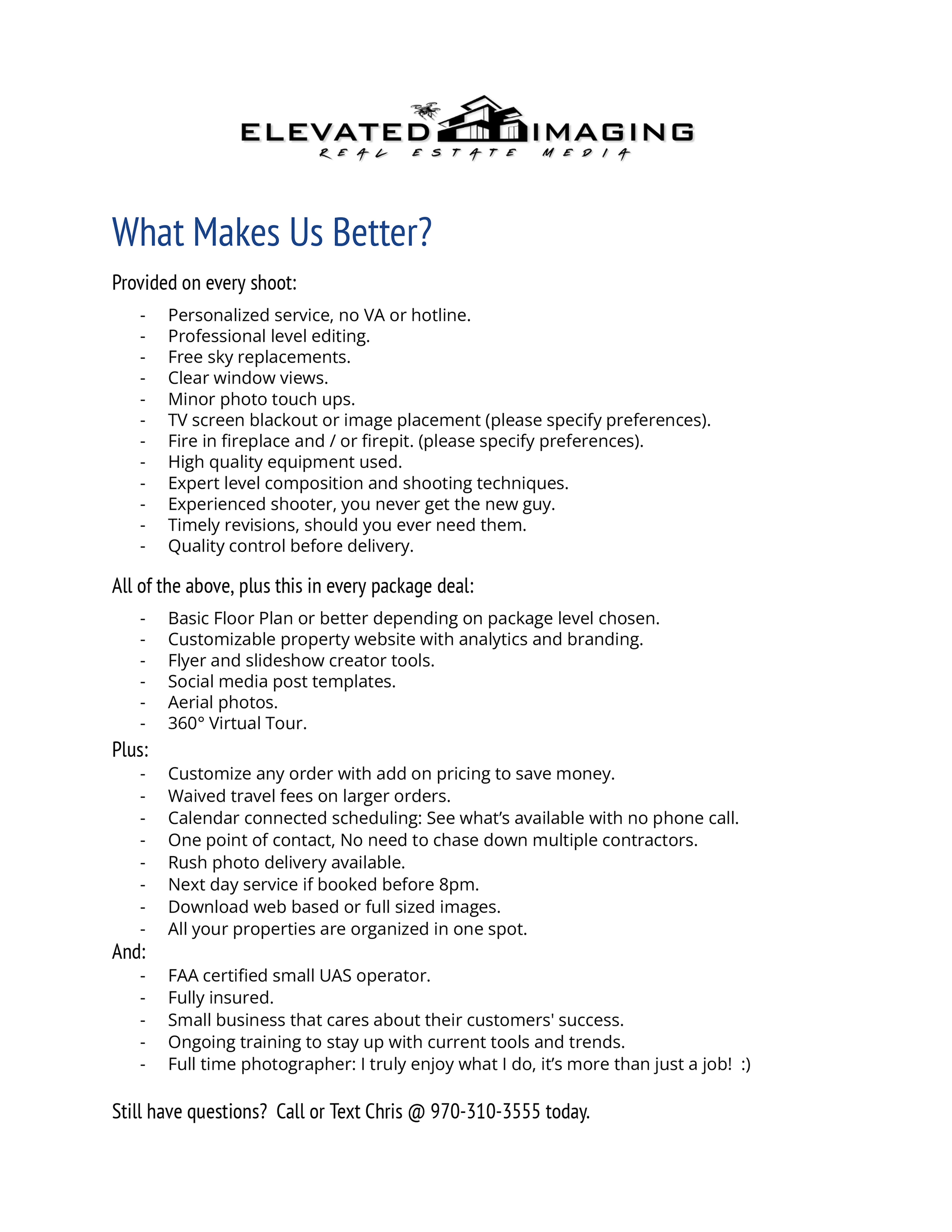 Usage rights are listed on the download page and are given to the purchaser for their promotion of the property or business only. Media is not to be given to other entities for their promotional use without expressed written consent from Elevated Imaging.